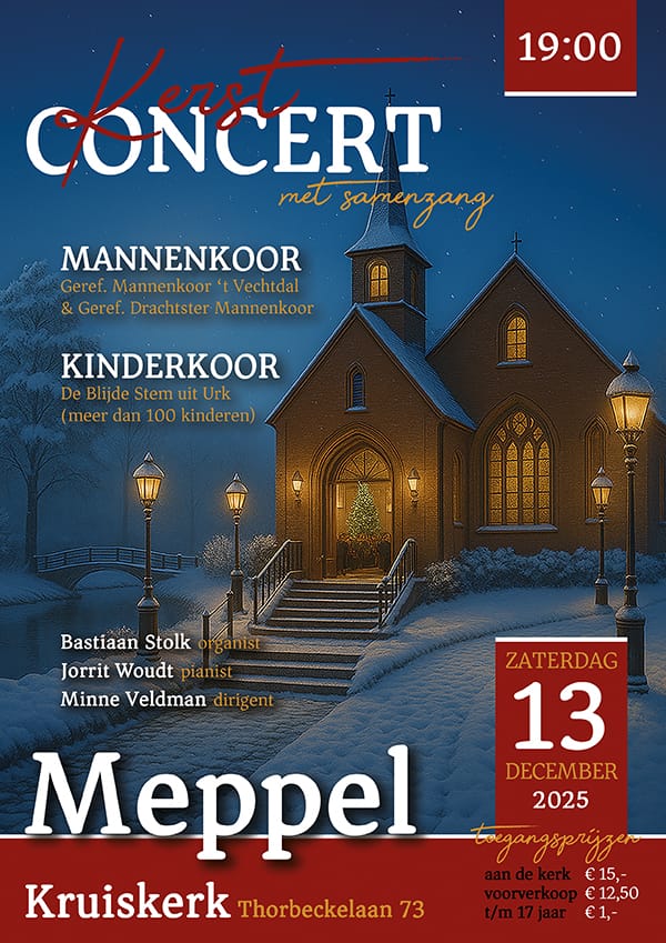 Gezamenlijk kerstconcert met mannenkoor 't Vechtdal (Hardenberg) en kinderkoor De Blijde Stem (Urk) in NGK De Kruiskerk te Meppel (Thorbeckelaan 73). Aanvang: 19:00 uur.